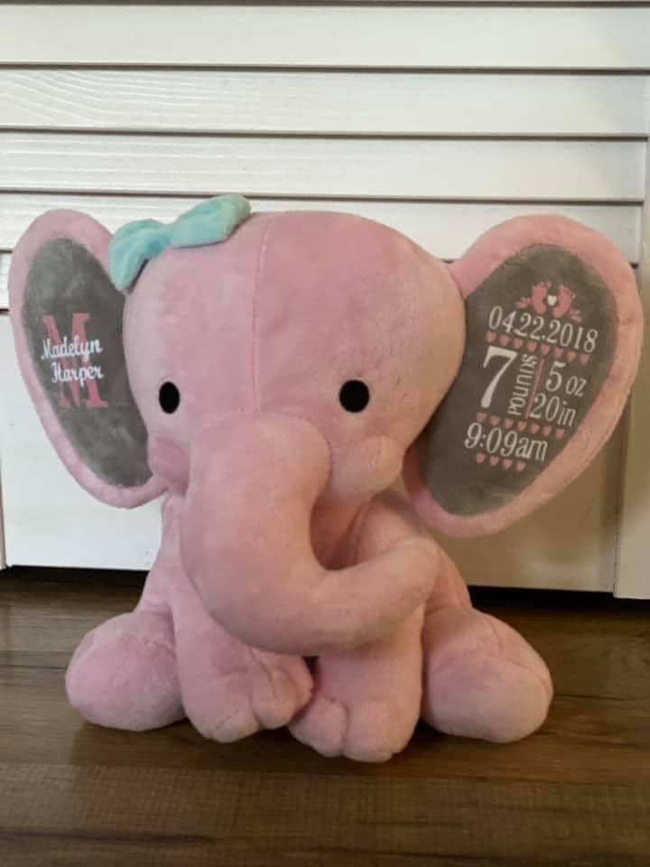 These adorable elephants make the perfect keepsake to celebrate the birth of your new baby. Stuffed elephants are customized with all of your child's birth information on the ears using heat transfer vinyl. Plush elephant that measures approximately 10"