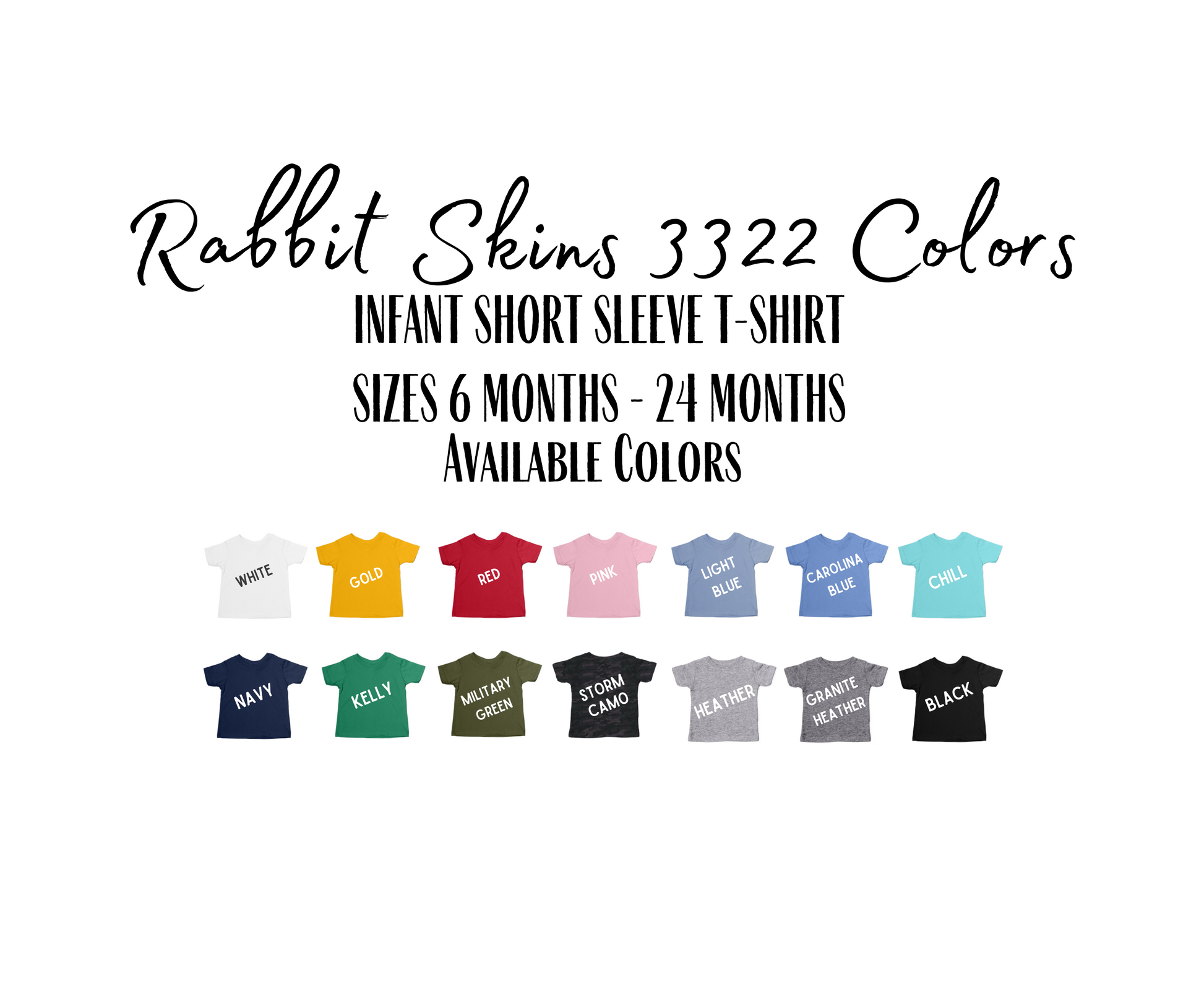 Please refer to the included size and color charts. Please specify your shirt color choice in the Notes to Seller section.
